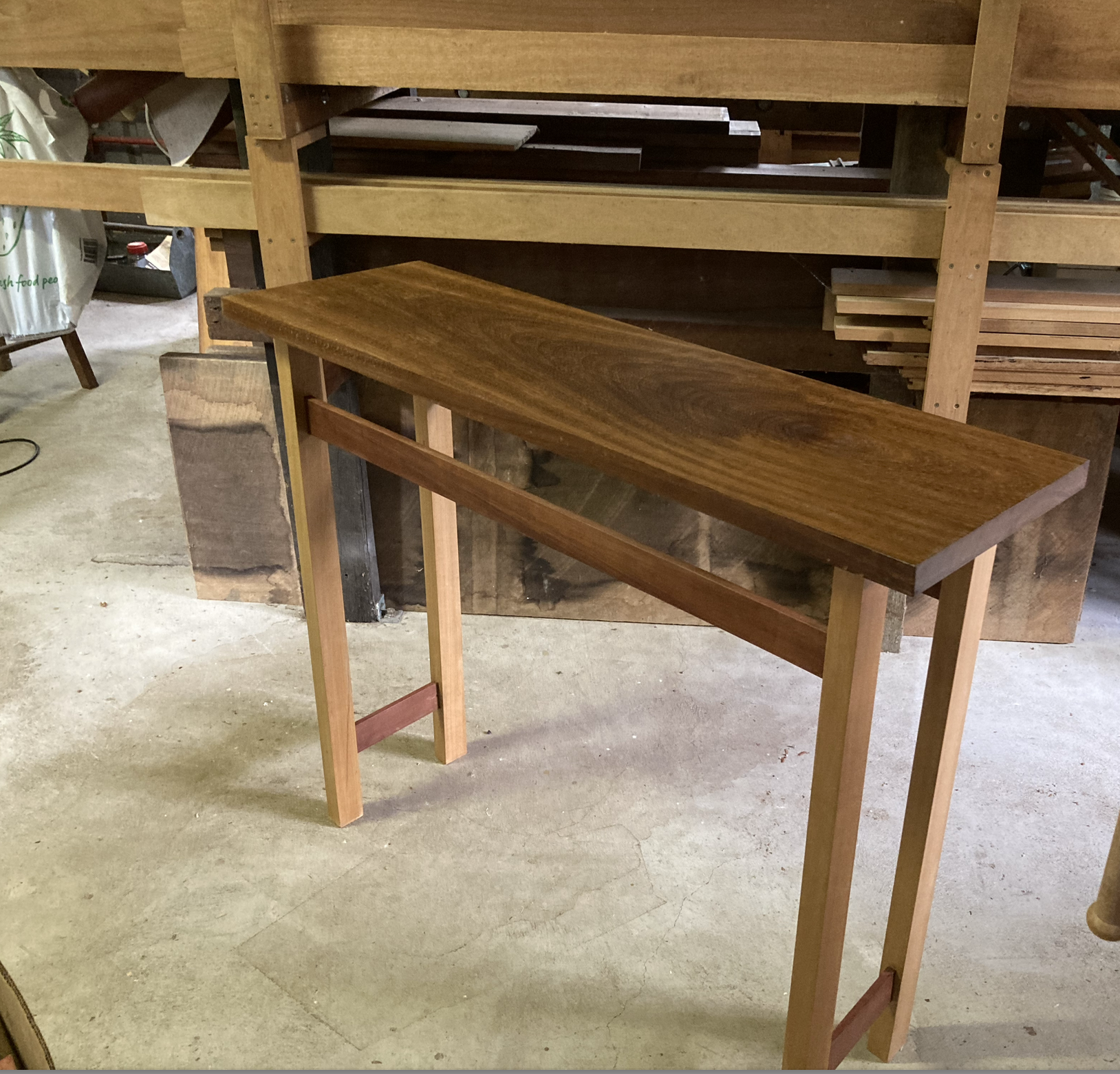 - April 2026. Hall table, Iroko top, beech legs, Tasmanian myrtle crosspieces.
